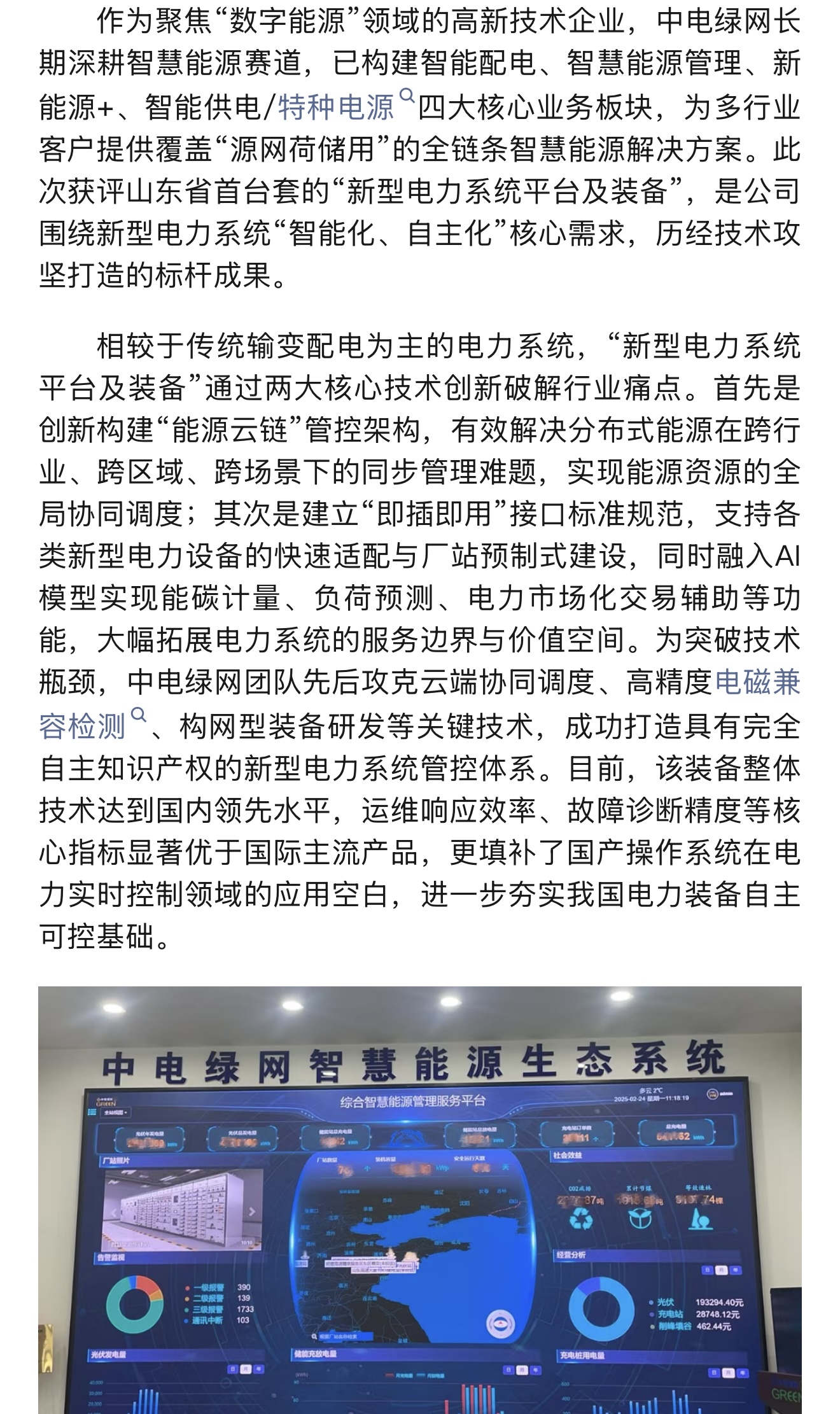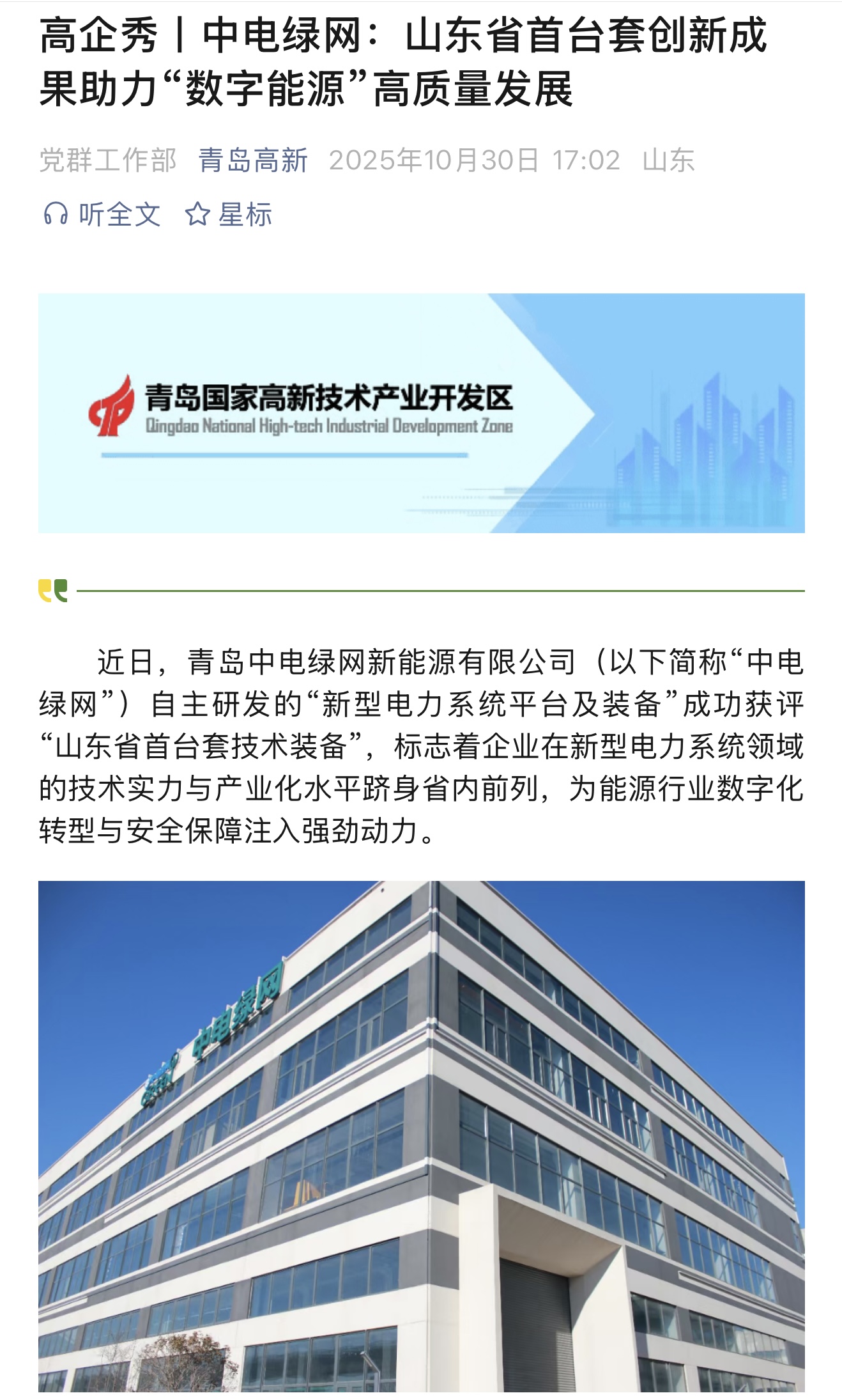 2025年10月30日,青島高新公眾號發布一篇“中電綠網:山東省首臺套創新成果助力“數字能源”高質量發展”報道,具體內容如下:
